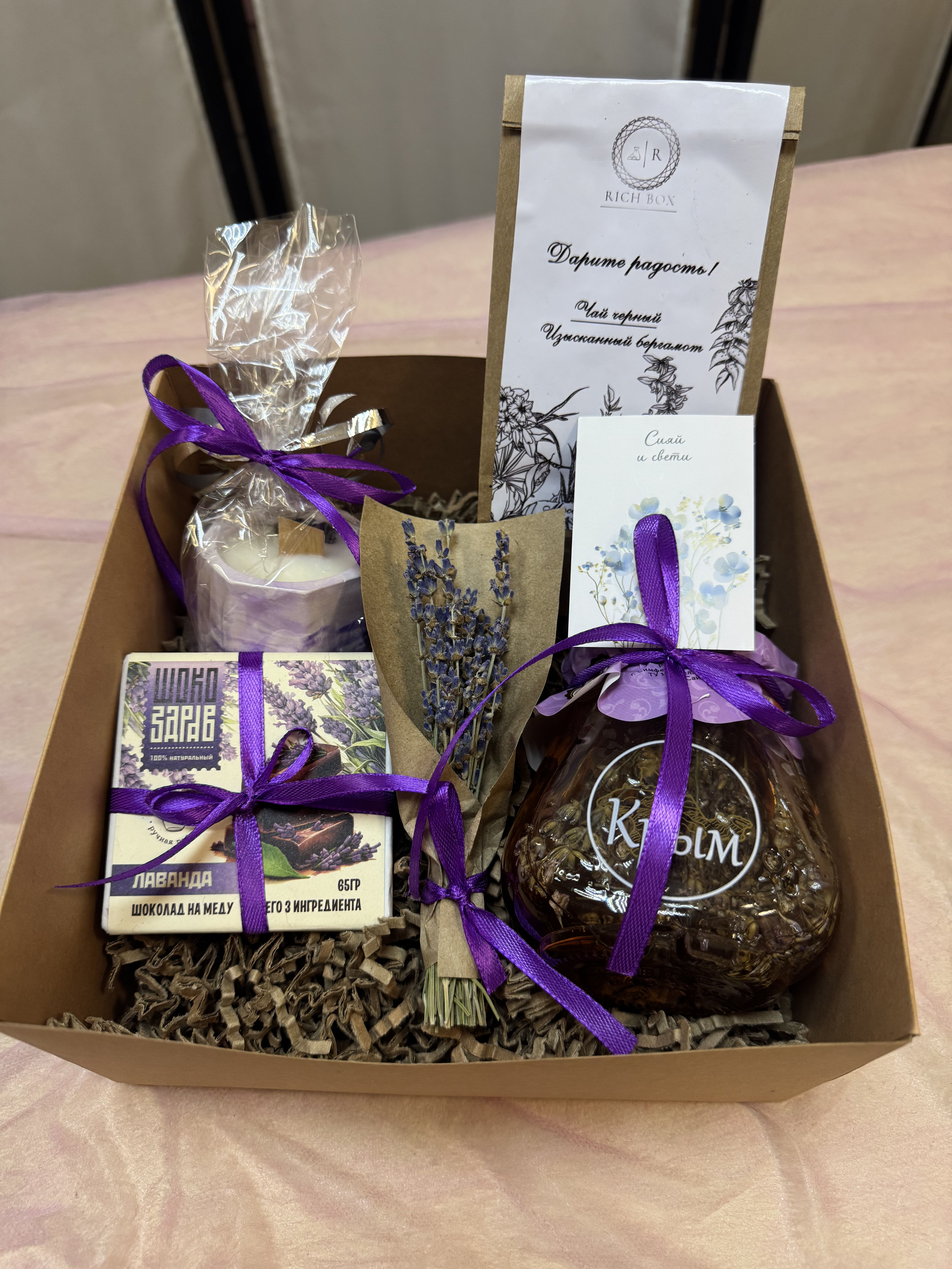 Состав набора: 1. Чай коллекционный черный " Изысканный бергамот" 2. Лавандовое варенье из Крымской лаванды 330 гр 3. Ароматическая свкча "Лаванда" 4. Шоколад на меду без сахара с лавандой 65 гр 5. Букетик сухоцветов "Крымская лаванда" 6. Открытка 7. Крафтовый наполнитель 8. Крафтовая коробка 20Х20Х10 см 9.Лента атласная (цвет в ассортименте)