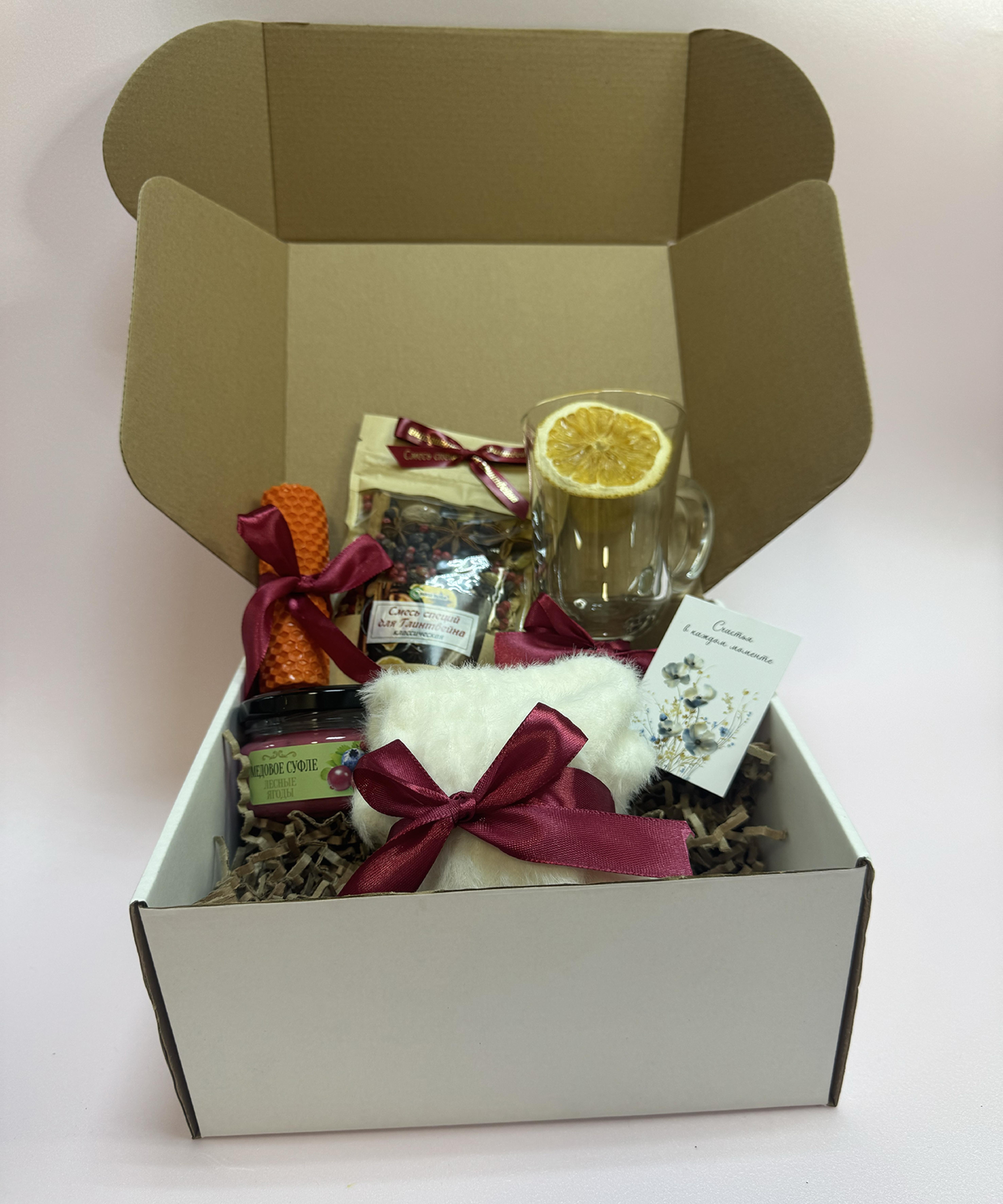 1. Смесь специй для глинтвейна классический. 2. Стакан с ручкой для глинтвейна 200 мл 3. Носки норка белые, мягкие, пушистые. Размер: 36 - 41. 4. Медовое суфле «Лесные ягоды» 5 Свеча медовая из вощины 6. Сушеные апельсины. 7. Открытка С пожеланиями. (в ассортименте) 8. Крафтовая коробка (цвет по желанию заказчика) 9. Крафтовый наполнитель. 10. Репсовая лента на коробку (цвет на выбор).