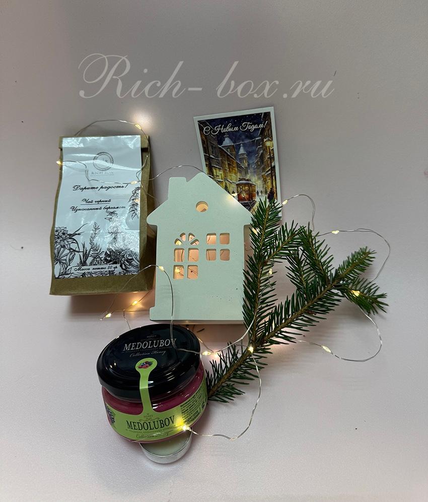 1. Черный коллекционный чай "Изысканный бергамот" 50 гр. 2. Подсвечник Домик со свечкой 3. Гирлянда Новогодняя на батарейках 3 м. Несколько режимов работы. 4. Медовое суфле «Лесные ягоды» 5. Сушеные апельсины, сезонный декор. 6. Открытка С Новым годом. (в ассортименте) 7. Крафтовая коробка (цвет по желанию заказчика) 8. Крафтовый наполнитель. 9. Репсовая лента Новогодняя на коробку (цвет на выбор).