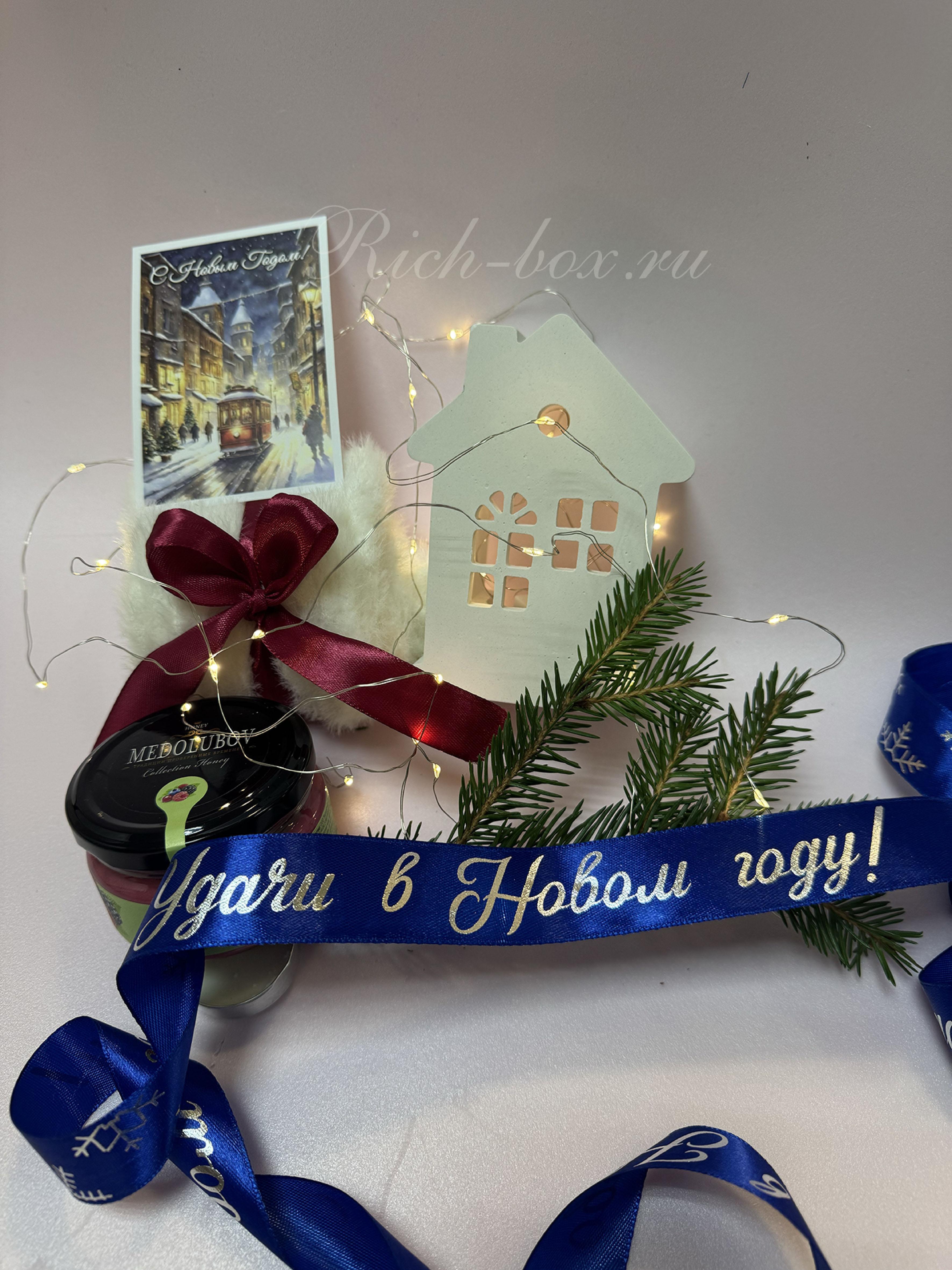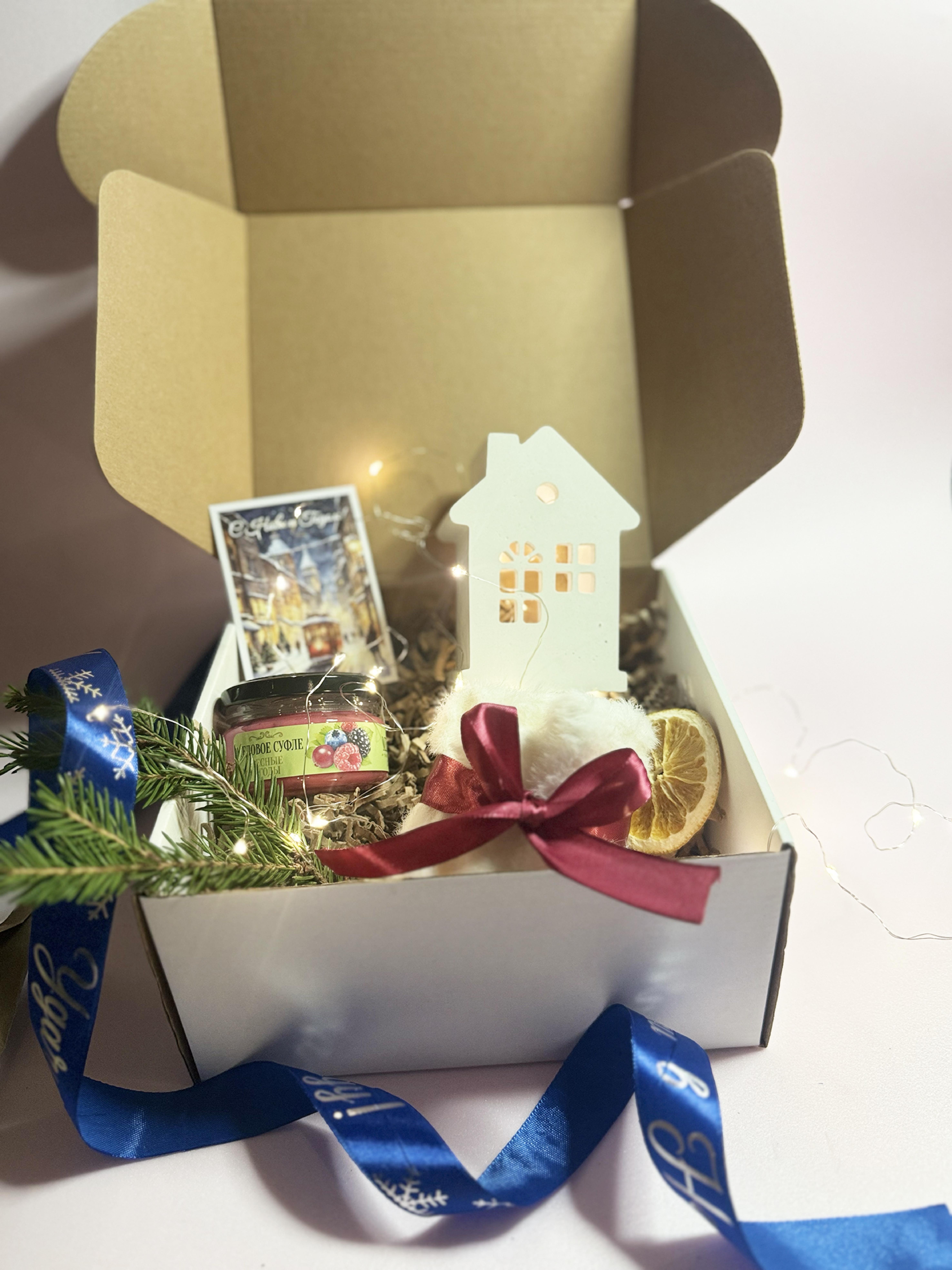 1. Подсвечник Домик со свечкой 2. Носки норка белые, мягкие, пушистые. Размер: 36 - 41. 3. Гирлянда Новогодняя на батарейках 3 м. Несколько режимов работы. 4. Медовое суфле «Лесные ягоды» 5. Сушеные апельсины. 6. Открытка С Новым годом. (в ассортименте) 7. Крафтовая коробка (цвет по желанию заказчика) 8. Крафтовый наполнитель. 9. Репсовая лента Новогодняя на коробку (цвет на выбор).