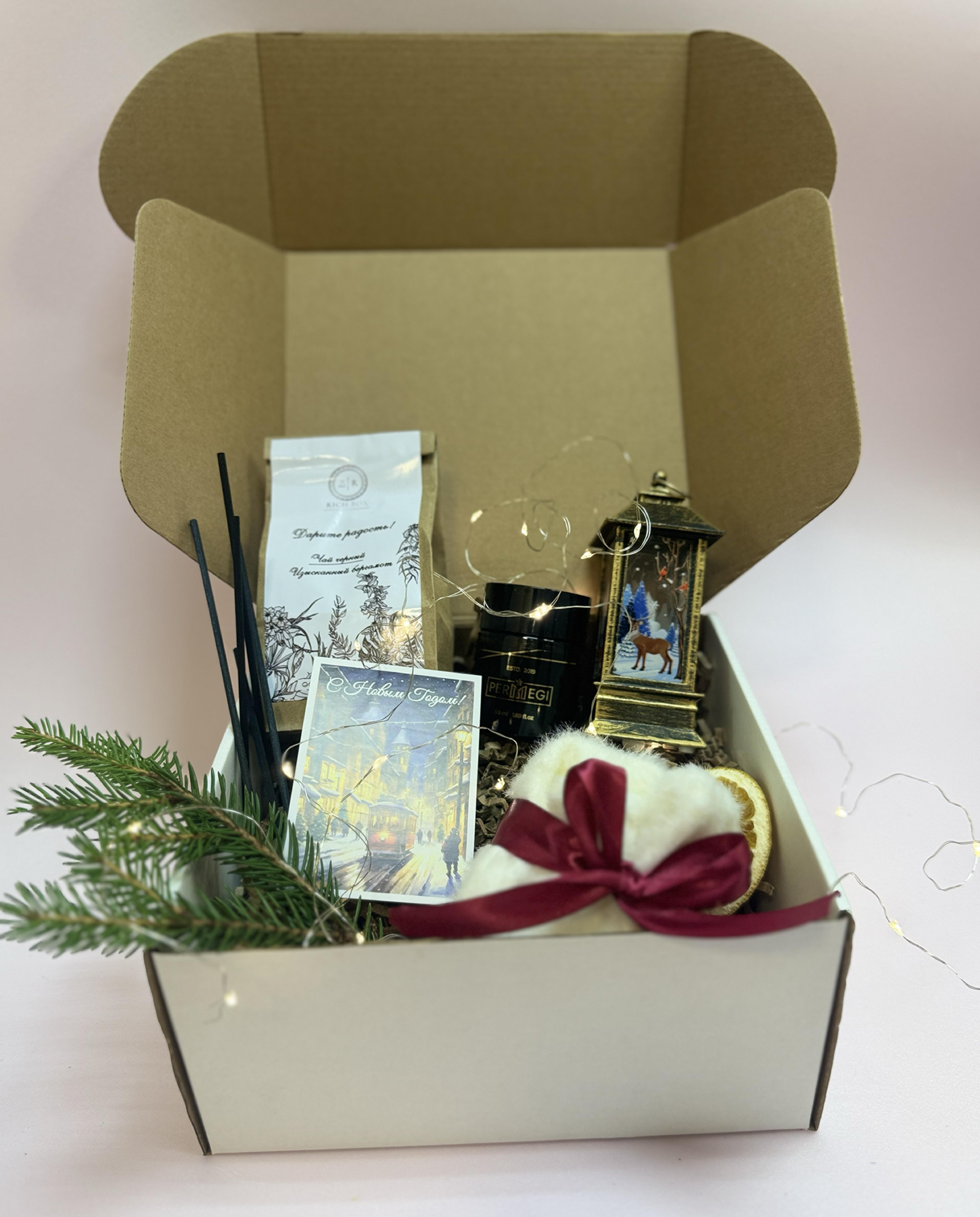 1. Черный коллекционный чай "Изысканный бергамот" 50 гр. 2. Фонарик Новогодний на батарейках. 3. Носки норка белые, мягкие, пушистые. Размер: 36 - 41. 4. Гирлянда Новогодняя на батарейках 3 м. Несколько режимов работы. 5. Диффузор для дома «Манго» с палочками 6. Сезонный декор. 7. Открытка С Новым годом. (в ассортименте) 8. Крафтовая коробка (цвет по желанию заказчика) 9. Крафтовый наполнитель. 10. Репсовая лента Новогодняя на коробку (цвет на выбор).