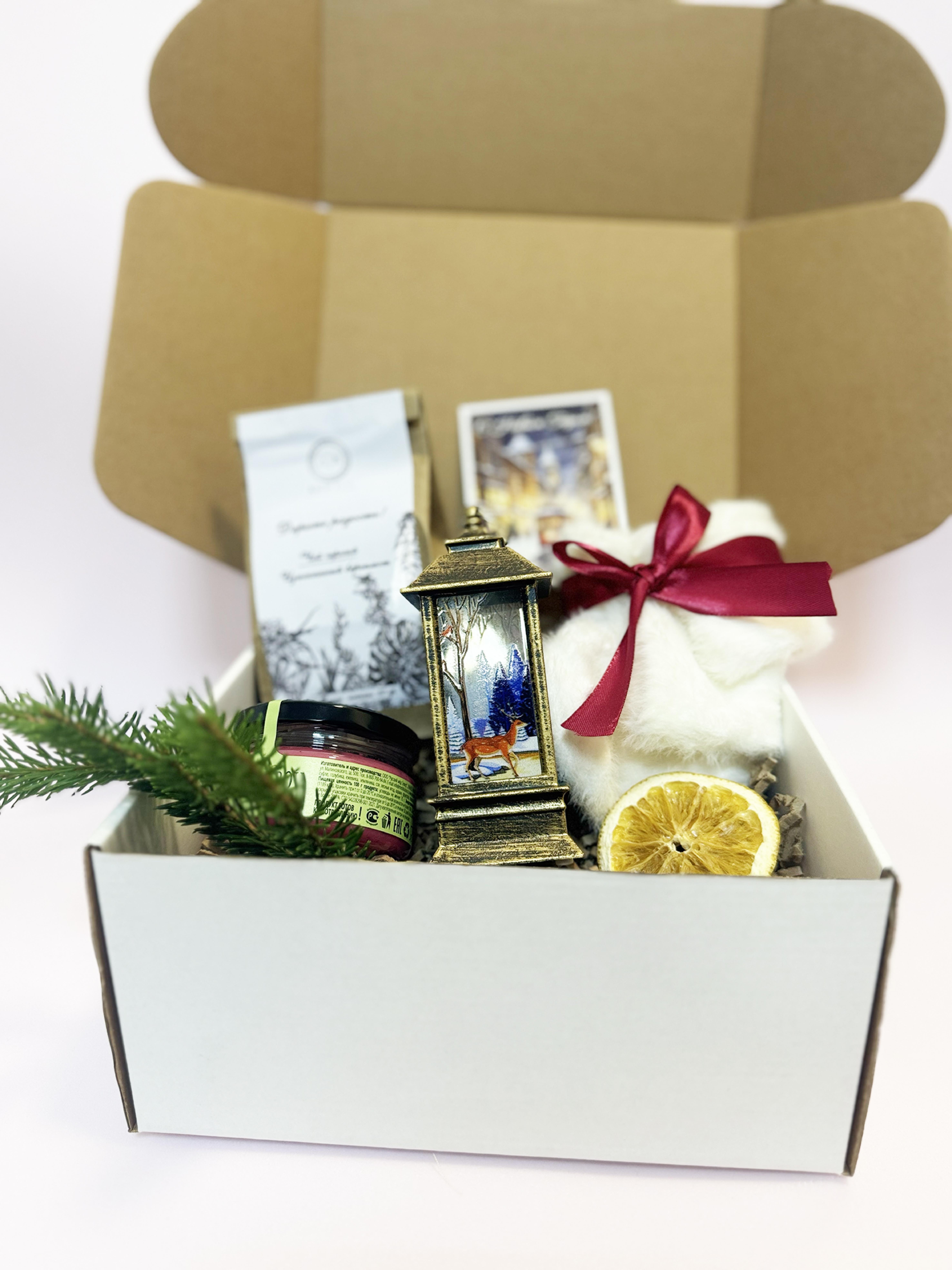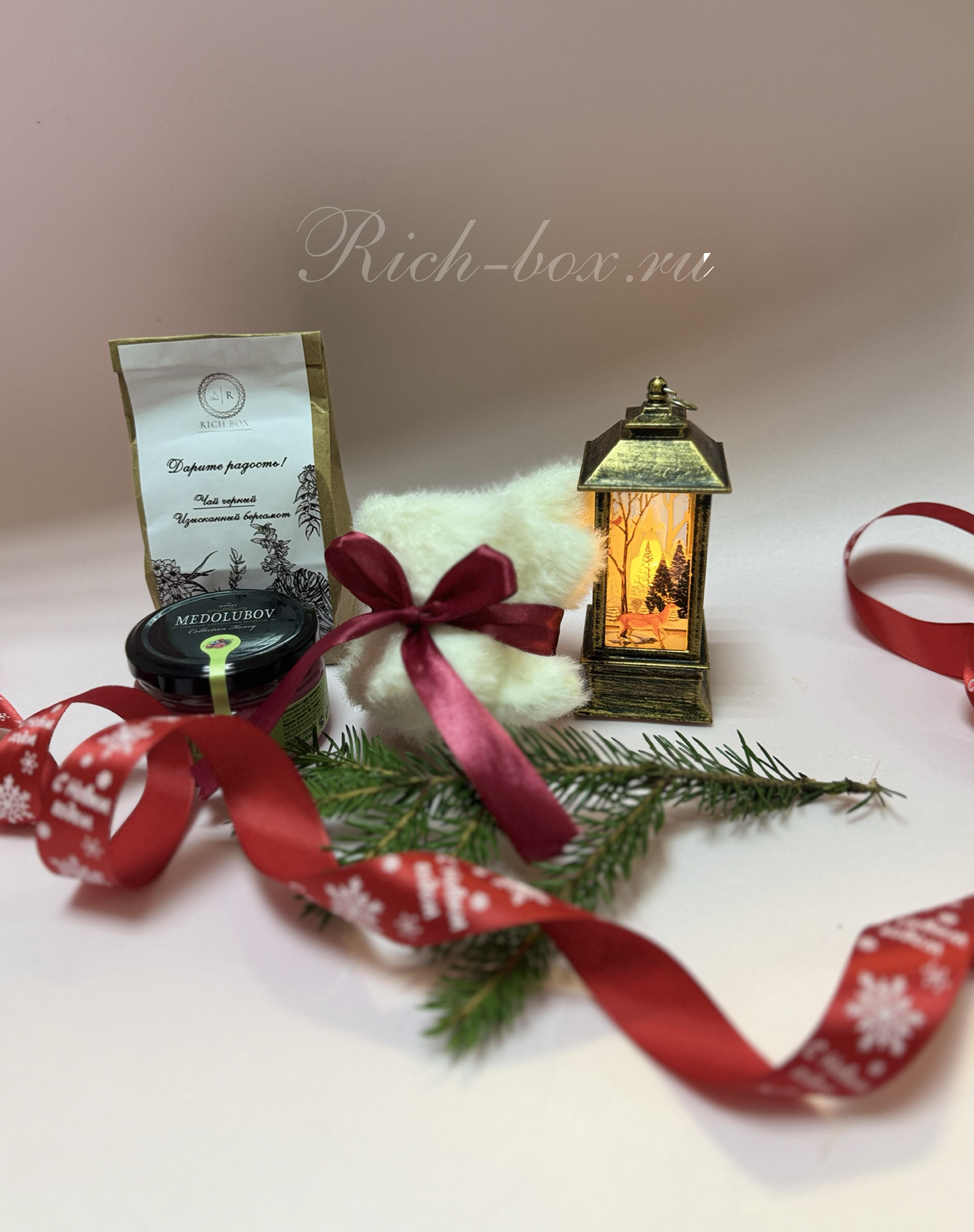 1. Черный коллекционный чай "Изысканный бергамот" 50 гр. 2. Фонарик Новогодний на батарейках. 3. Носки норка белые, мягкие, пушистые. Размер: 36 - 41. 4. Медовое суфле «Лесные ягоды» 5. Сезонный декор 6. Открытка С Новым годом. (в ассортименте) 7. Крафтовая коробка (цвет по желанию заказчика) 8. Крафтовый наполнитель. 9. Репсовая лента Новогодняя на коробку (цвет на выбор).