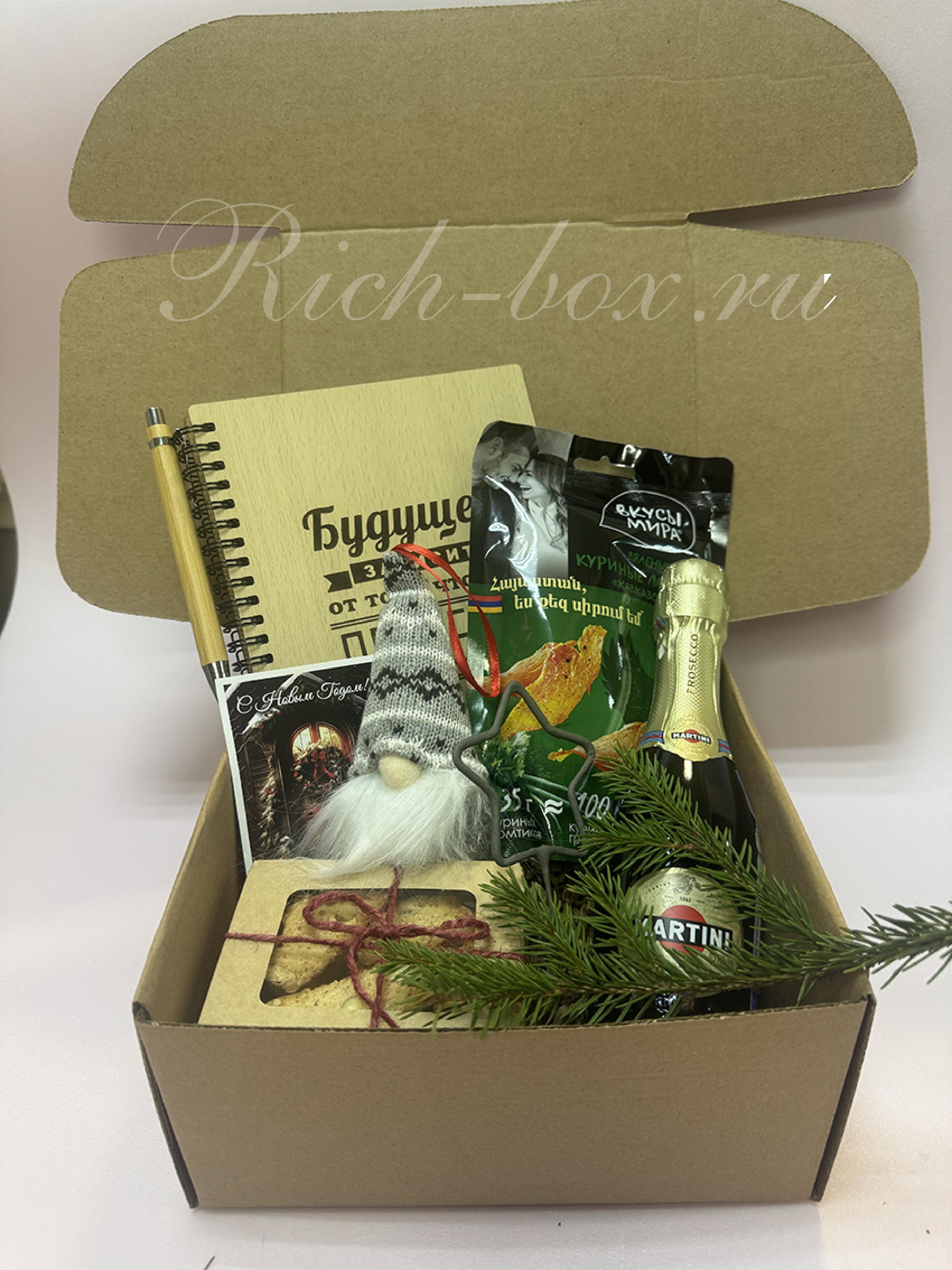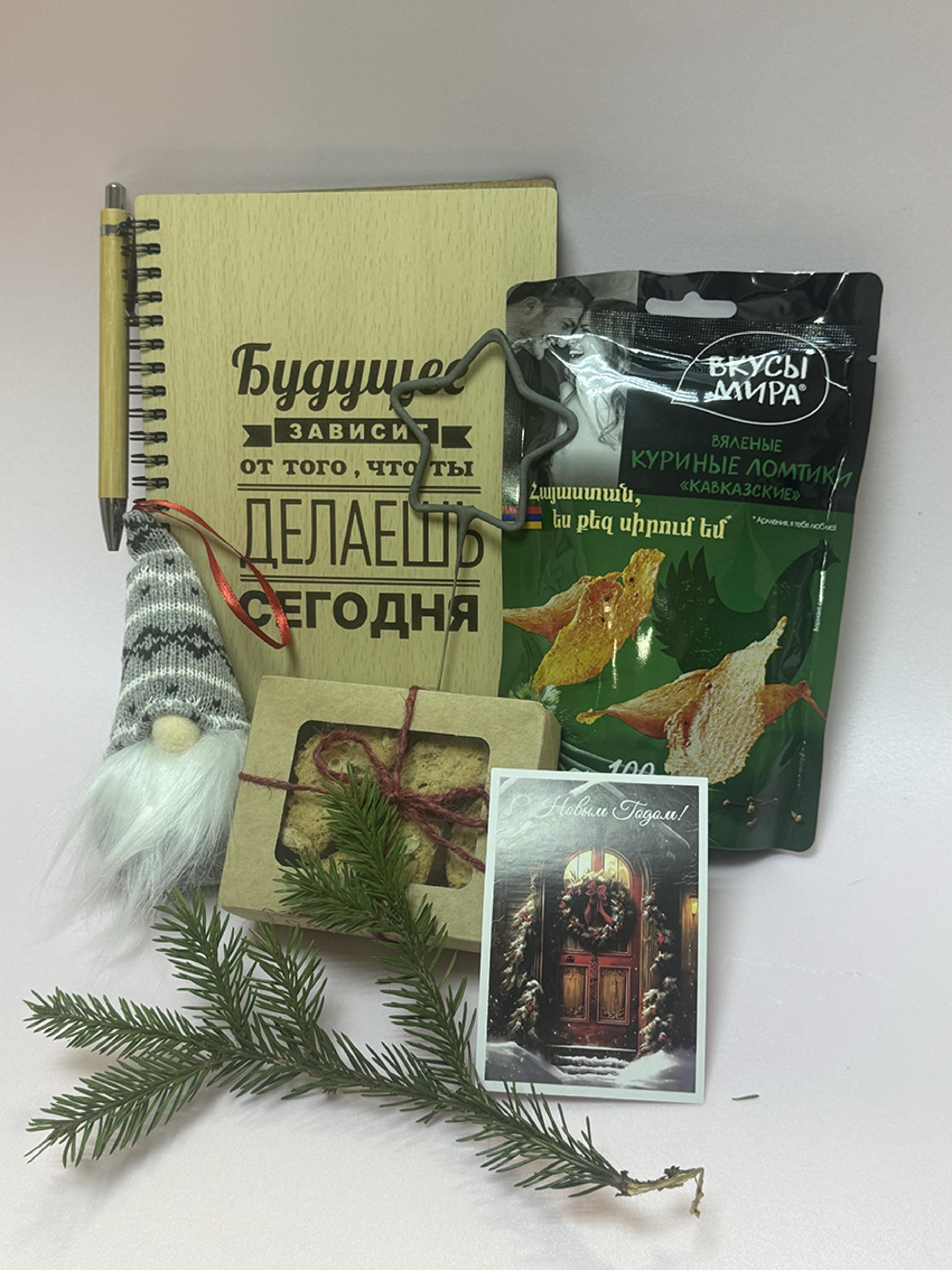 1. Блокнот деревянный формат А5 2. Ручка шариковая 3. Вяленое мясо «Вкусы мира» курица сушеная Кавказские специи 105 гр. 4. Печенье миндальное «Кантуччи» по итальянскому рецепту. 5. Игрушка на ёлку «Гномик» 6. Сезонный декор 7. Открытка С Новым годом. (в ассортименте) 8. Крафтовая коробка (цвет по желанию заказчика) 9. Крафтовый наполнитель. 10. Репсовая лента Новогодняя на коробку (цвет на выбор). * Внимание!!! Мы не торгуем алкоголем! Алкоголь предоставляет нам заказчик, а мы его просто добавляем в наборы.