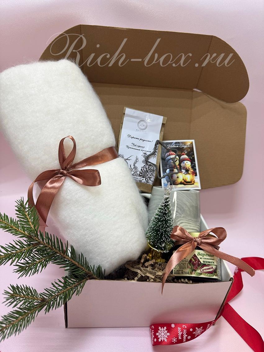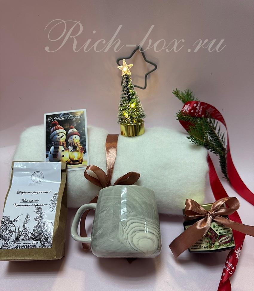 1.Кружка керамическая для чая и кофе "Серый мрамор", 400 мл. 2. Черный коллекционный чай «Таёжный» 50 гр. 3. Палантин кашемир теплый зимний (цвета в ассортименте). 4. Ёлочка новогодняя настольная со светодиодами. 5. Варенье из сосновых шишек 130 гр 6. Бенгальская свеча «Звезда» 7. Сезонный декор 8. Открытка С Новым годом (в ассортименте) 9. Крафтовая коробка (цвет по желанию заказчика) 10. Крафтовый наполнитель. 11. Репсовая лента Новогодняя на коробку (цвет на выбор).