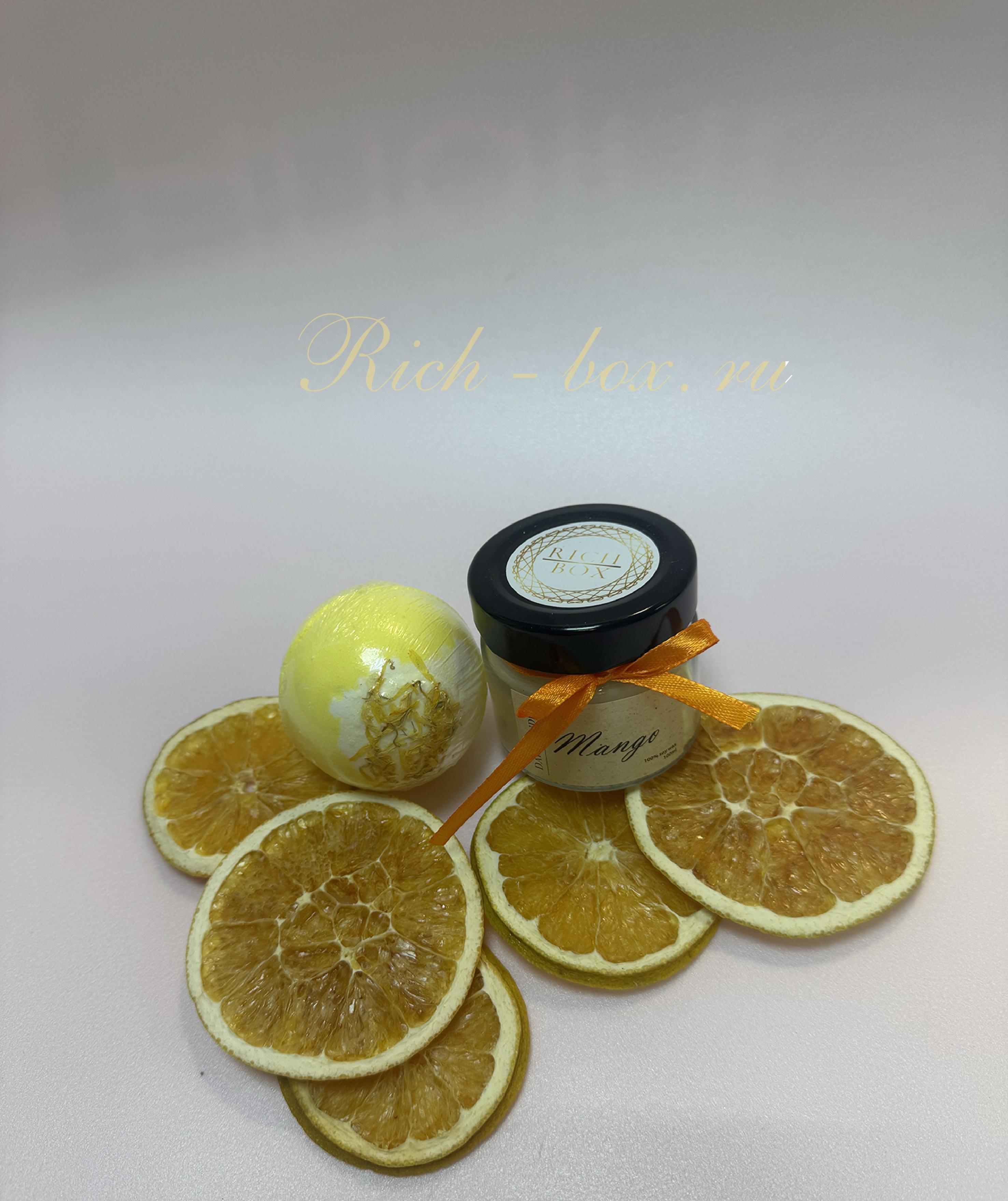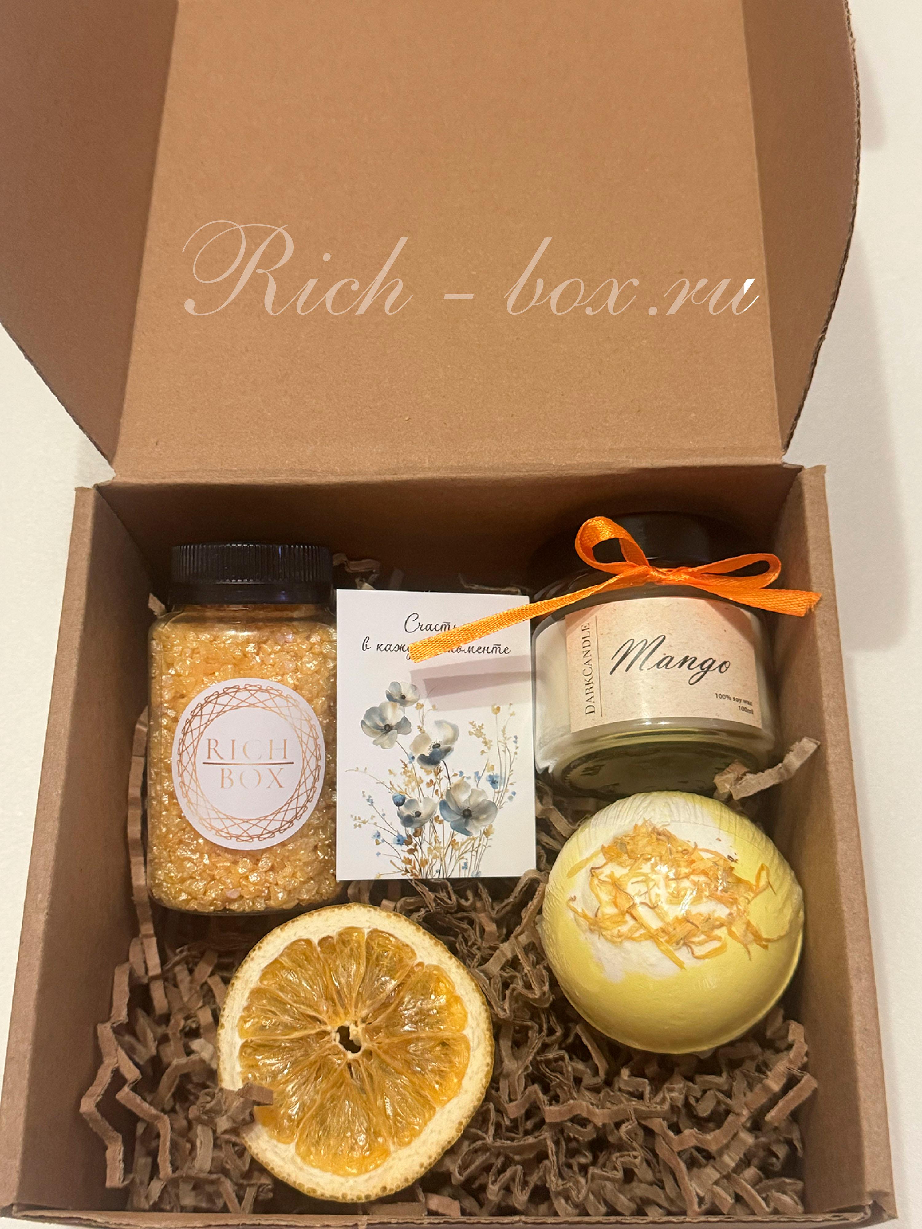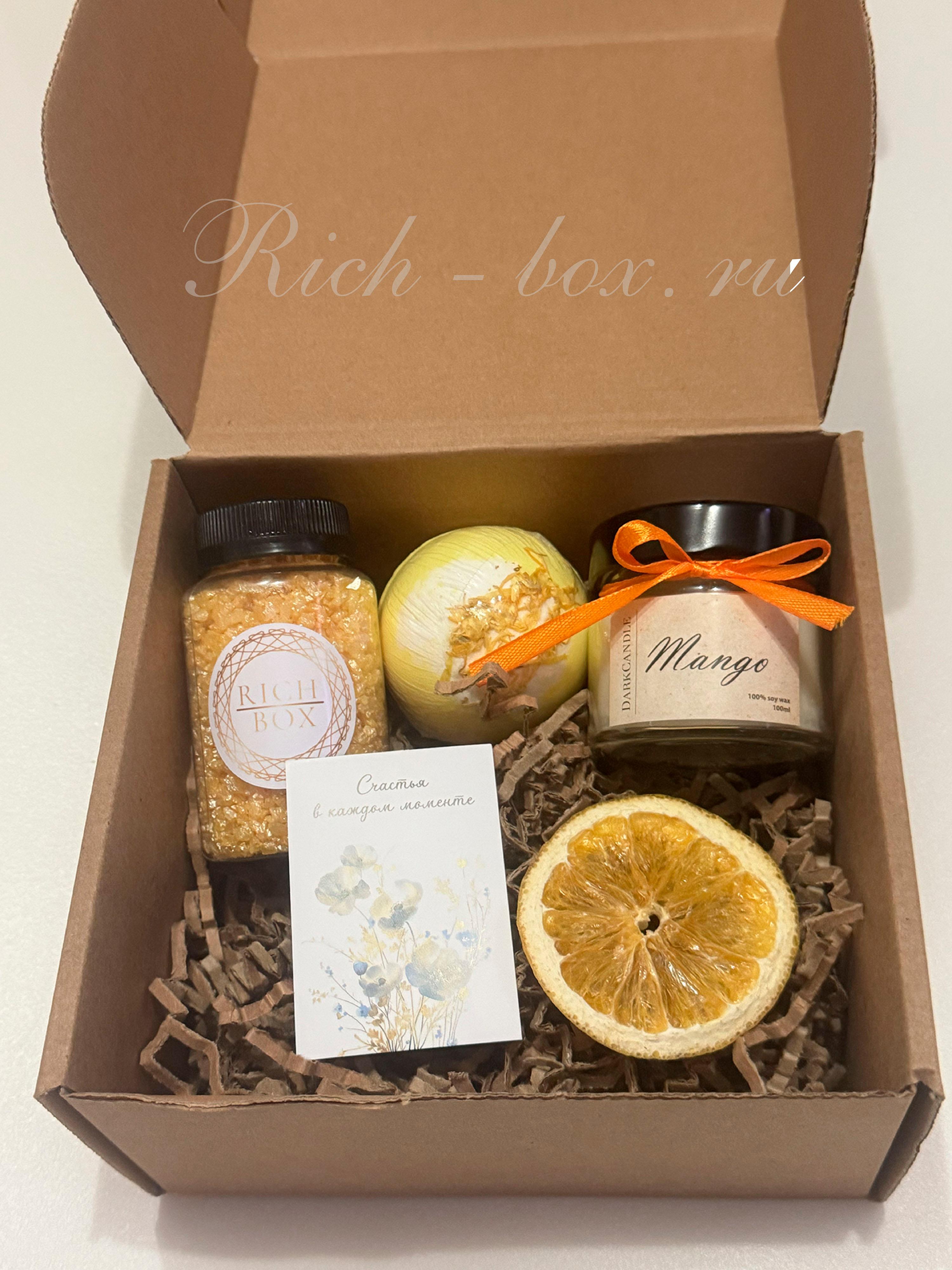 1. Свеча ароматическая Манго Свеча объемом 100 мл горит до 20 часов, создавая уютную обстановку и наполняя ваш дом приятным ароматом. 2. Бомбочка для ванны Календула. Аромат календулы волшебный, успокаивающий и расслабляющий, восстанавливающий внутреннюю силу. Масло календулы способствует самопознанию и саморазвитию, приносит ощущение чистоты, исцеления, счастья. 3. Соль для ванны Манго. Соль для ванны морская натуральная ароматизированная с ароматом манго. Содержит полезные микроэлементы, морские минералы и аромамасла из Франции. 4. Сушеные апельсины. 5. Открытка С пожеланиями. (в ассортименте) 6. Крафтовая коробка 7. Крафтовый наполнитель. 8. Репсовая лента на коробку (цвет на выбор).